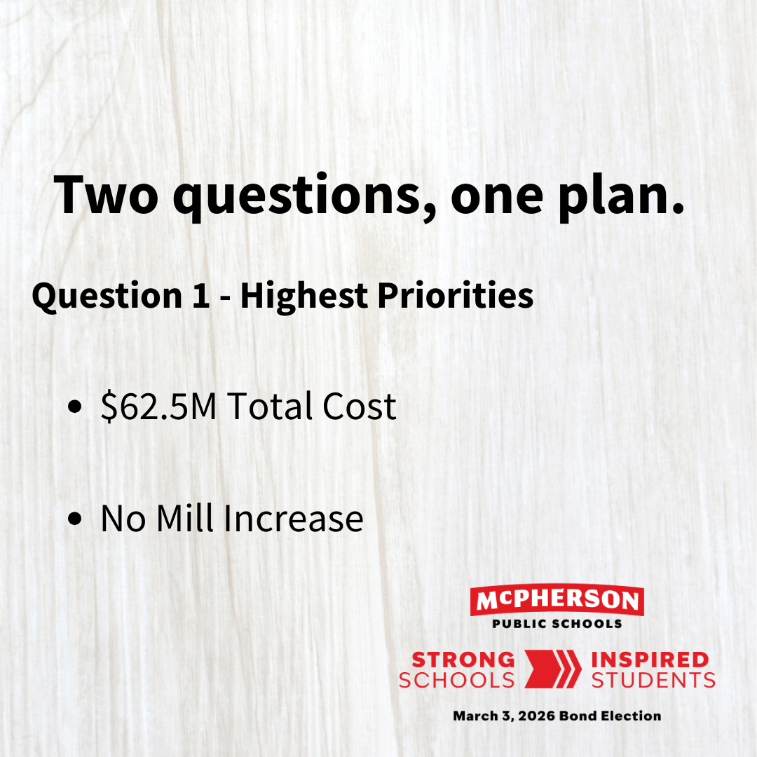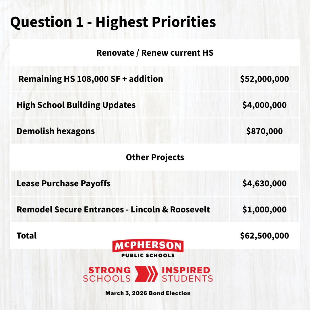 Question 1 totals $62.5 million and does not require a mill levy increase. Because the district is paying off an existing bond six years early, a successful Question 1 would continue the current mill rate and roll it into a new bond to fund these projects. Adjustments to the local option budget also help create room to cover these costs while maintaining the existing mill rate.