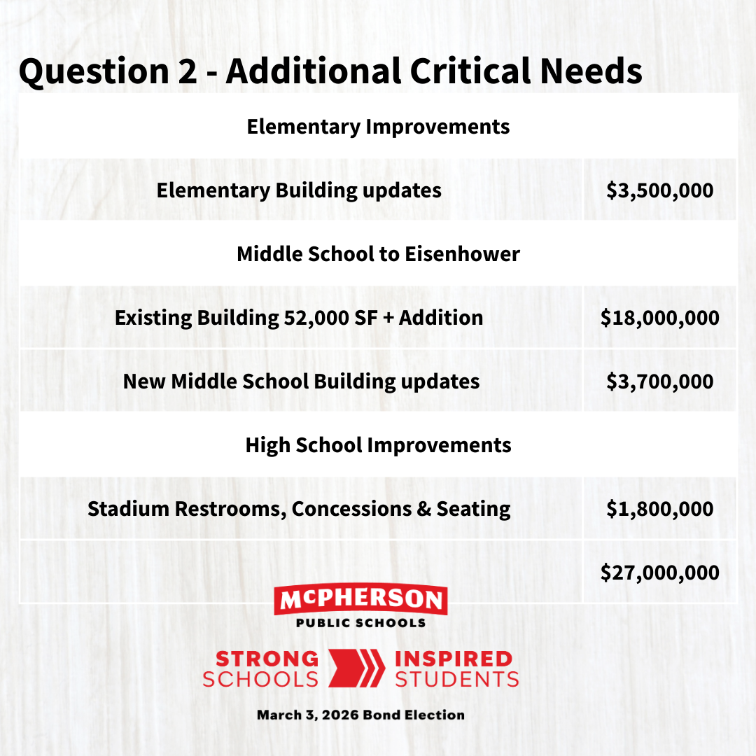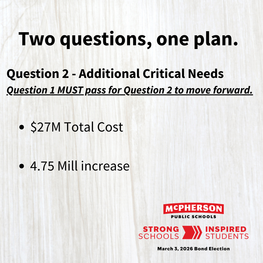 Question 2 totals $27 million and would require a 4.75 mill increase. For the median McPherson homeowner, with a $200,000 home, this is estimated at about $9.10 per month.
